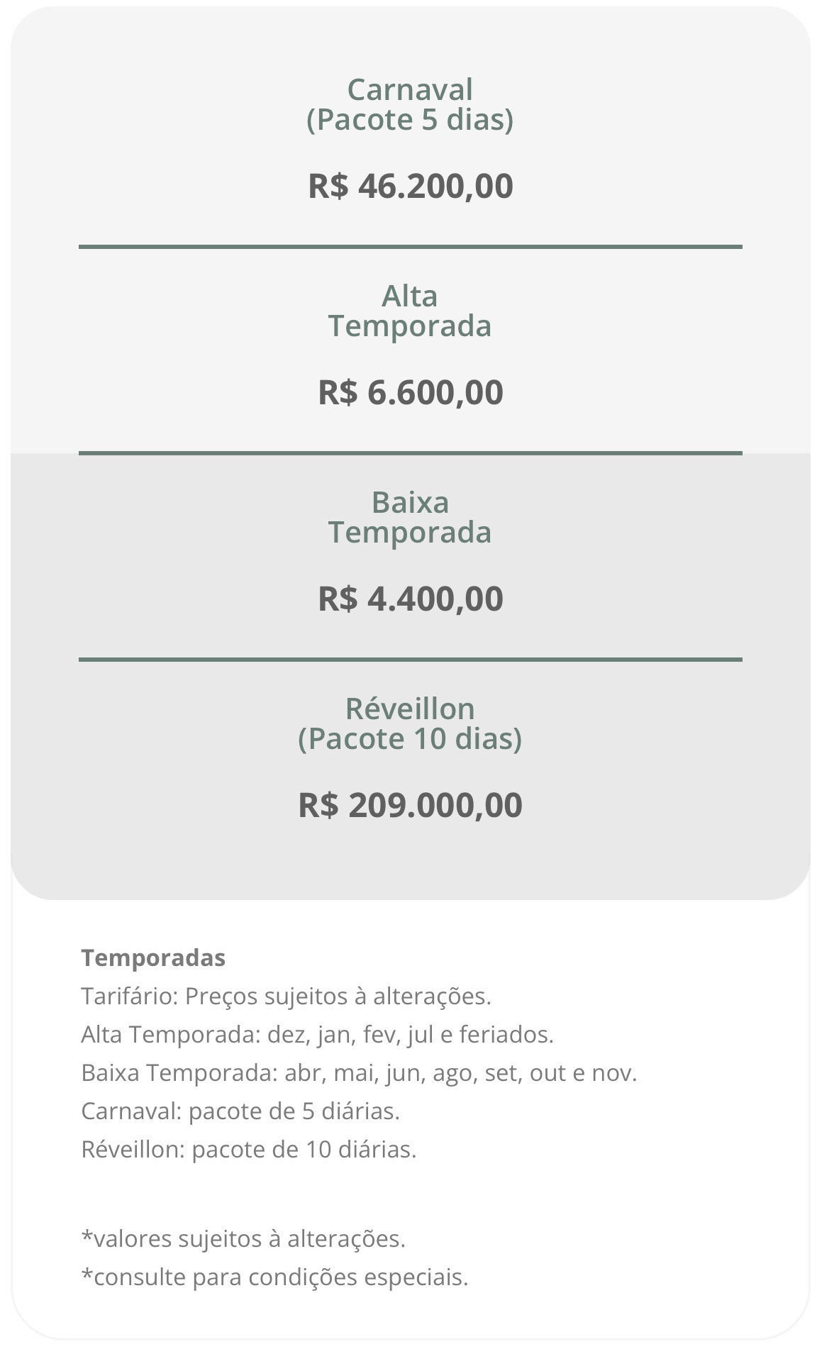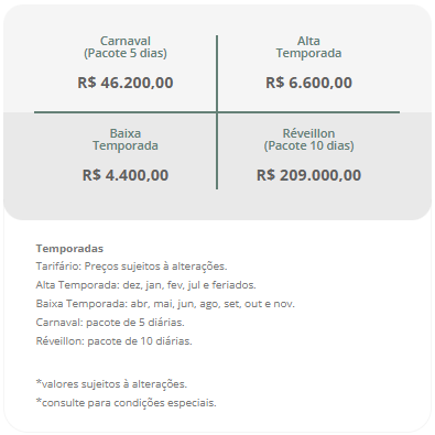 Valores de locação por temporada